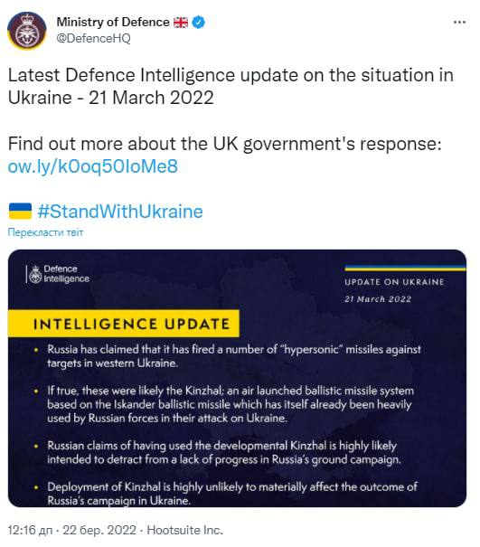 При этом в британской разведке считают, что "применение "Кинжалов" вряд ли существенно повлияет на ход кампании РФ в Украине".