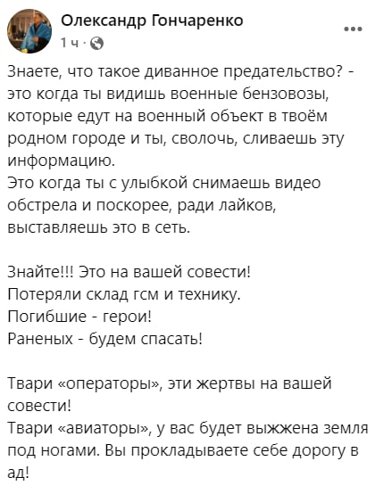 "Знаете, что такое диванное предательство? - это когда ты видишь военные бензовозы, которые едут на военный объект в твоём родном городе и ты, сволочь, сливаешь эту информацию. Это когда ты с улыбкой снимаешь видео обстрела и поскорее, ради лайков, выставляешь это в сеть. Знайте!!! Это на вашей совести! Потеряли склад гсм и технику. Погибшие - герои! Раненых - будем спасать! Твари "операторы", эти жертвы на вашей совести! Твари "авиаторы", у вас будет выжжена земля под ногами. Вы прокладываете себе дорогу в ад!", - написал Александр Гончаренко в своем Facebook.