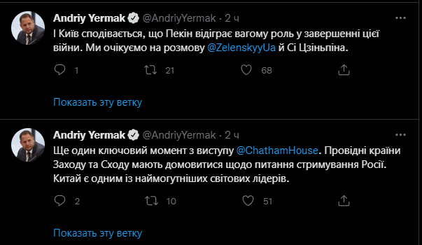 "Киев надеется на то, что Пекин сыграет весомую роль", - написал Ермак в Twitter.