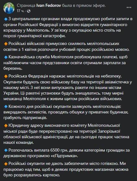 Он также заявил, что продолжаются попытки открыть гуманитарный коридор в Мелитополь через запросы в официальные органы РФ.