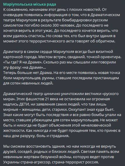 Мариупольский городской совет заявляет, что в результате бомбардировки драматического театра могло погибнуть 300 человек. Эту цифру горсовет даёт ссылаясь на рассказы очевидцев.