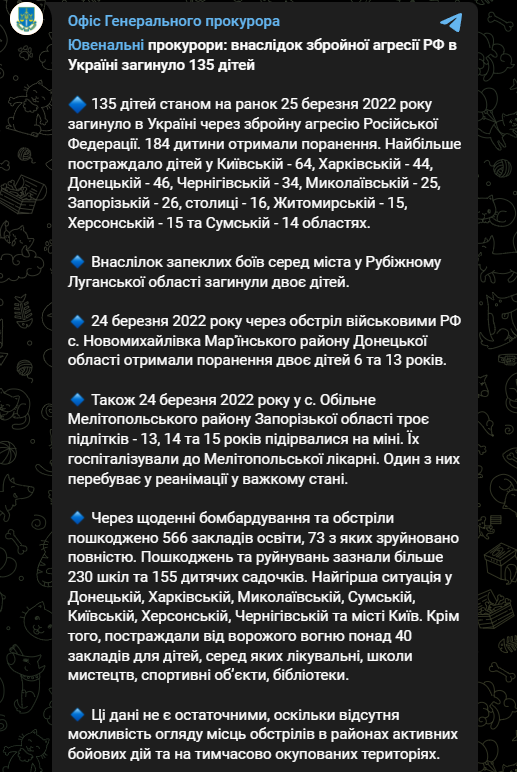 В Украине с начала войны в результате российской агрессии уже погибли 135 детей. При этом ранения различной степени тяжести получили более 184 детей.