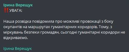 "Наша разведка сообщила о возможных провокациях со стороны оккупантов на маршрутах гуманитарных коридоров. Поэтому из соображений безопасности граждан сегодня гуманитарные коридоры не открываем", - написала Ирина Верещук.