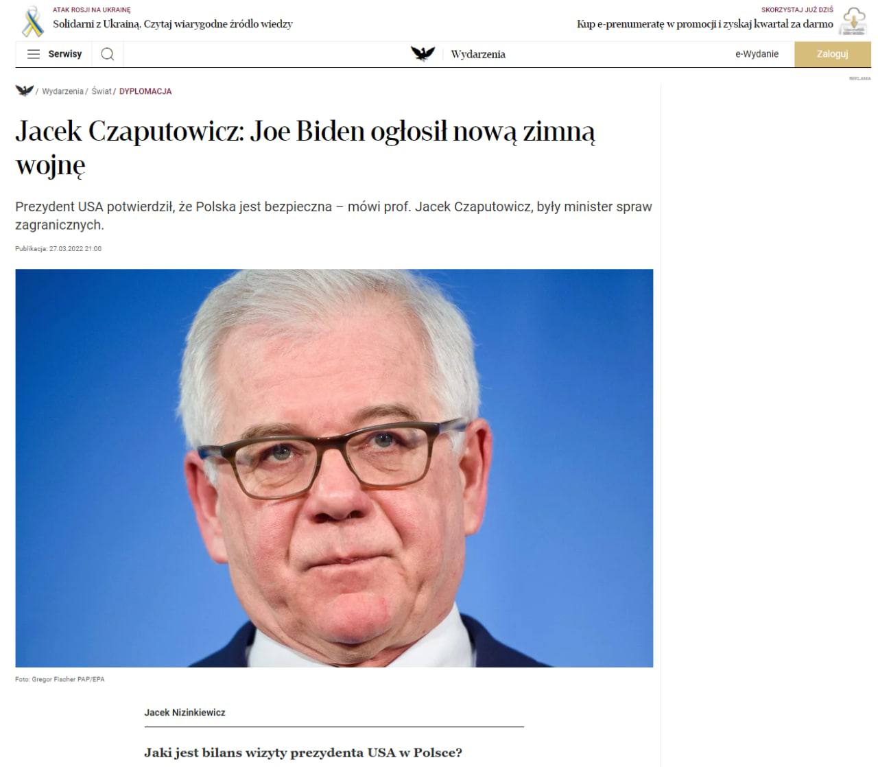 11.05 "Выступление Байдена в Варшаве было построено таким образом, чтобы открыть новую главу в истории. В этой речи президент США объявил о новой холодной войне", - сообщил экс-министр иностранных дел Польши Яцек Чапутович