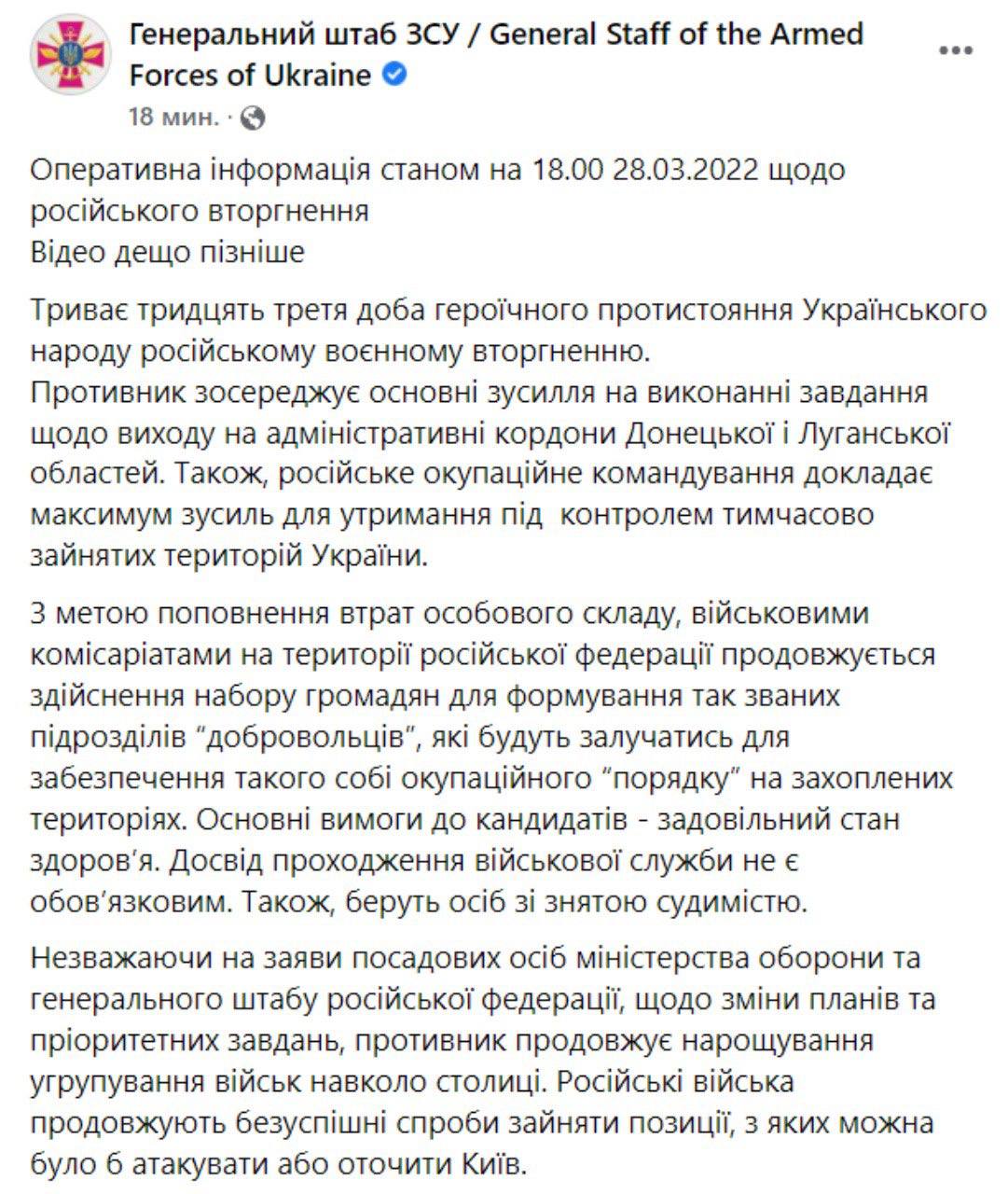 Оперативная сводка Генштаба ВСУ по состоянию на 24:00 28 марта 2022 года
