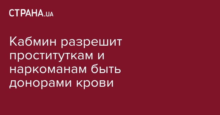 Кабинет Министров поручил Министерству здравоохранения отменить запрет быть донорами крови и ее компонентов наркоманам и проституткам до июля. Об этом говорится в распоряжении №1393 от 23 ноября 2015 года, опубликованном на сайте правительства.