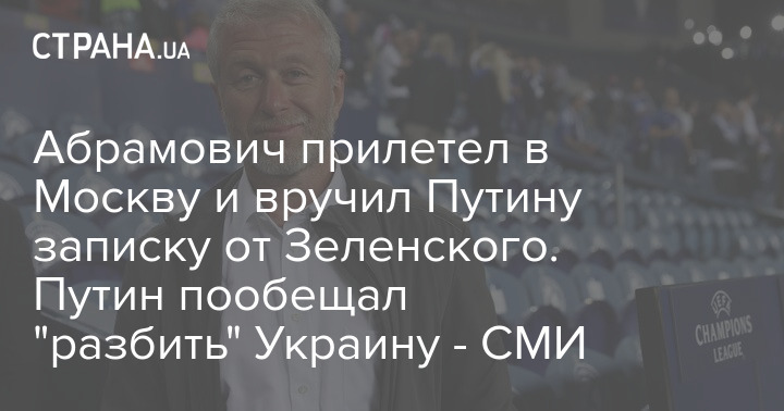 Неофициальный переговорщик между Киевом и Москвой Роман Абрамович прилетел в Москву, где передал президенту России Владимиру Путину условия мира от Владимира Зеленского. Путин их якобы яростно отклонил и пообещал "разбить" Украину.