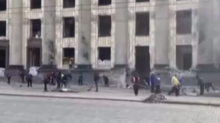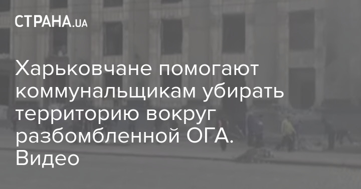 Харьковчане помогают коммунальщикам убирать территорию вокруг разбомбленной ОГА. Видео
