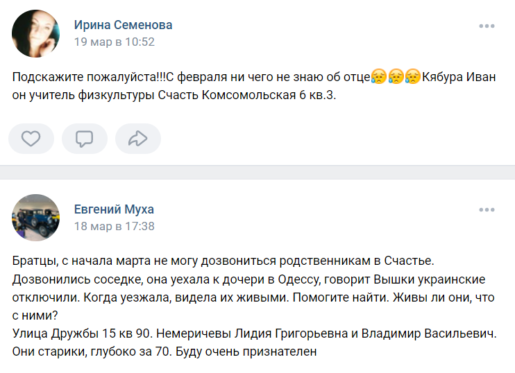 В пабликах городов самое распространенное сегодня объявление - это поиск родственников, с которыми нету связи. Люди пытаются узнать судьбу тех, кто остался в населенных пунктах, попавших за последний месяц под власть "ЛНР" и "ДНР".