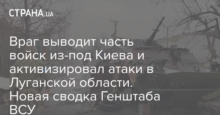 Генштаб ВСУ подтверждает факт вывода части войск РФ с территории под Киевом как на правом так и на левом берегу Днепра. Сообщается, что противник перегруппировывает силы в направлении на Славянск и активизировал атаки на города в Луганской области - Северодонецк, Лисичанск, Рубежное и Попасная. Об этом идет речь в обновленной сводке Генштаба ВСУ по состоянию на полдень четверга, 31 марта.