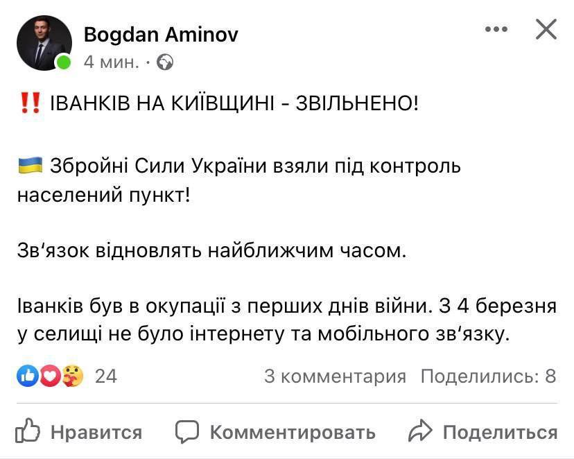10.08 Журналист Богдан Аминов сообщает, что пгт Иванков (80 километров к северу от Киева, около Чернобыльской зоны) освобождён ВСУ. Судя по всему, российские войска ушли и оттуда.