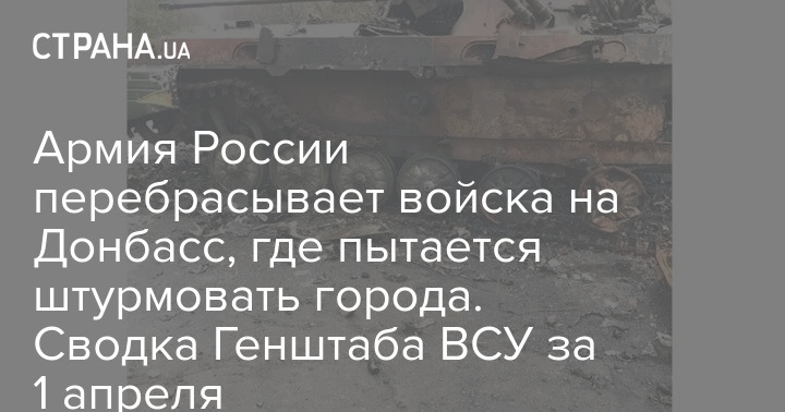 В Генеральном штабе Вооруженных сил Украины опубликовали оперативную сводку по состоянию на 24:00 1 апреля, в которой говорится, что Российская Федерация наносит систематические ракетные и авиационные удары по объектам критической инфраструктуры и жилым кварталам населенных пунктов, а также, с целью создания наступательных группировок, продолжает перегруппировку войск.