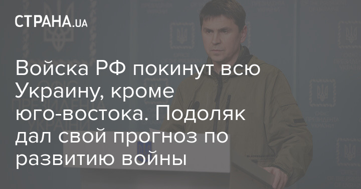 Советник главы Офиса президента Михаил Подоляк прогнозирует, что российские войска покинут всю территорию Украины кроме юго-востока, а ожидать "изнурительного" противостояния не стоит. Соответствующий пост он опубликовал в Twitter.