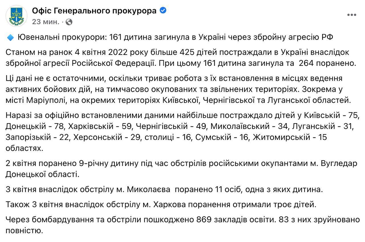 За время войны в Украине погибло не менее 161 ребенка, еще 264 - ранены - Офис генпрокурора
