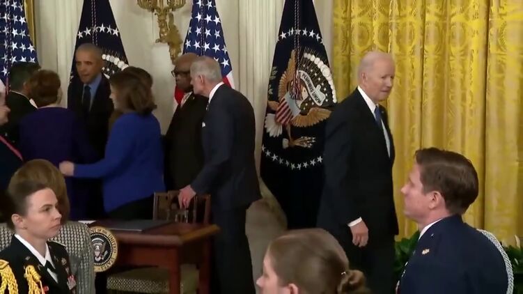 На видео с приема в Белом доме видно, как Байден с озадаченным выражением лица смотрит на окружившую Обаму толпу, а затем смущенно разводит руками.