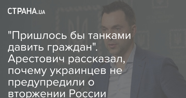 Советник главы Офиса президента Алексей Арестович заявил, что если бы украинцев предупредили о вторжении РФ, это вызвало бы массовый поток беженцев. По его словам, 10-12 миллионов беженцев полностью парализовали бы дороги и армия бы не прошла по ним.