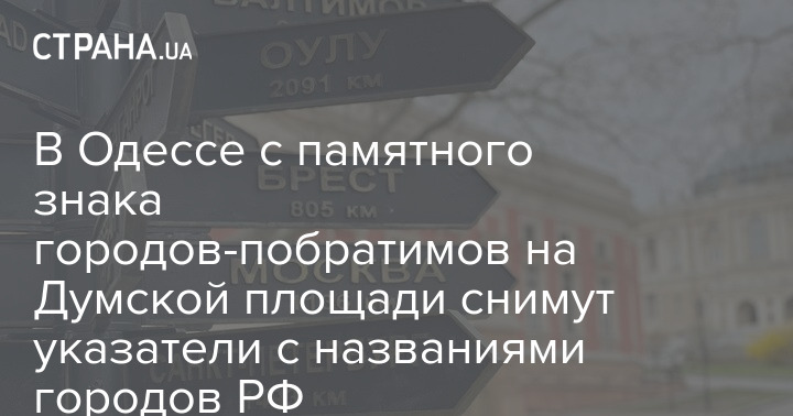 В Одессе с памятного знака городов-побратимов и городов-партнёров на Думской площади исчезнут указатели городов Российской Федерации. Речь идет о Волгограде, Москве, Ростове-на-Дону, Санкт-Петербурге и Таганроге.