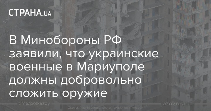 Минобороны РФ подтвердило информацию о том, что Россия не согласна выпустить защитников Мариуполя из почти разрушенного города и требует от них сдачи в плен, о чем сегодня говорил президент Украины Владимир Зеленский