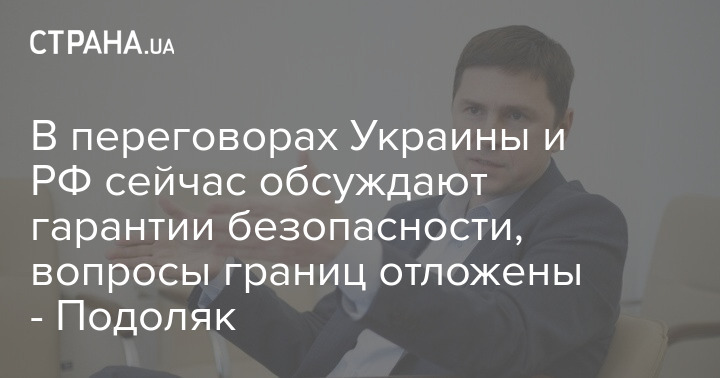 Советник главы Офиса президента Михаил Подоляк на фоне публикаций в СМИ о том, что между Украиной и Россией идёт интенсивный переговорный процесс, согласованы некоторые документы и идут дискуссии о послевоенных границах страны, заявил, что основное обсуждение в переговорных группах идёт сейчас вокруг обсуждения гарантий безопасности. А вопросы территориального устройства вынесены за скобки.