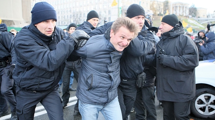 Как сообщает корреспондент "Страны" один человек задержан, его посадили в машину полиции, однако активисты заблокировали авто правоохранителей. Задержан парень из Луцка, приехавший в Киев на пикет.