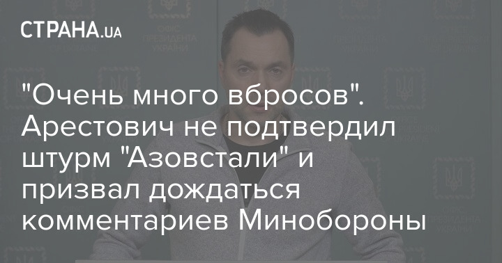 Советник главы ОП Алексей Арестович призвал дождаться официальных комментариев Минобороны касательно ситуации на "Азовстали", о штурме которой российскими войсками накануне сообщили журналисты.
