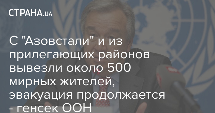 Генсек ООН Антониу Гутерриш сообщил, что при поддержке Красного Креста с "Азовстали" в Мариуполе и из прилегающих районов удалось эвакуировать около 500 мирных жителей.