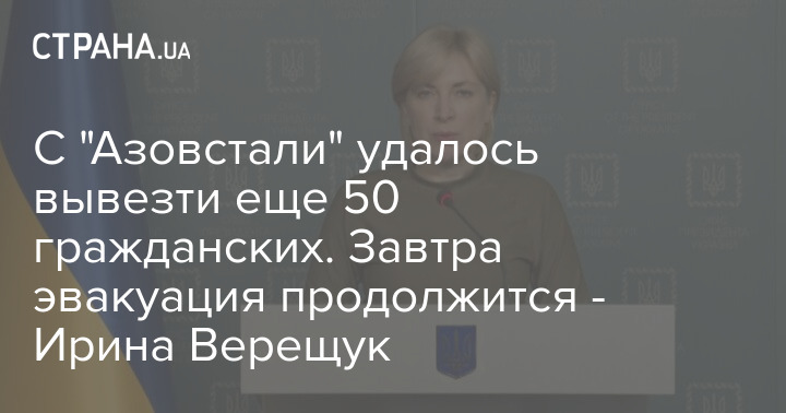 Верещук добавила, что сегодня из "Азовстали" удалось вывезти 50 женщин, детей и пожилых людей. С утра эвакуация будет продолжена.