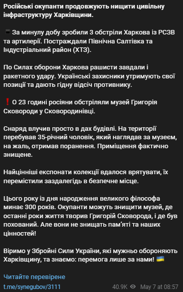 Об этом сообщает глава Харьковской ОВА Олег Синегубов.
