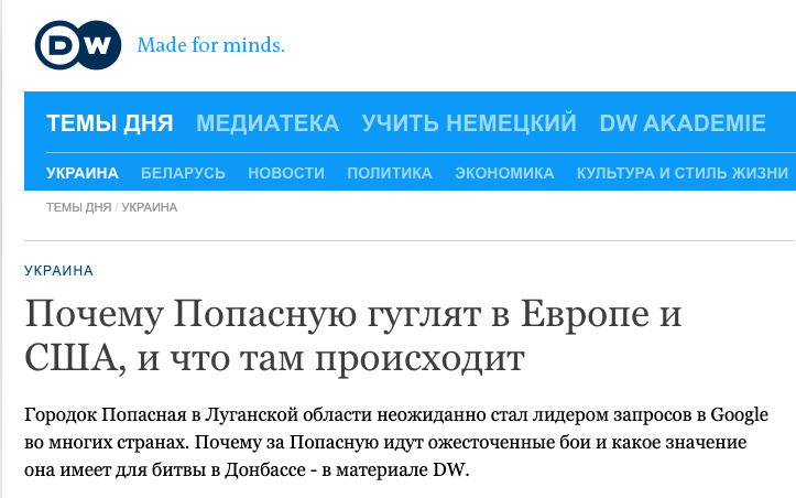 После публикации этого видео на сайте CNN пользователи интернета по всему миру начали искать в поисковиках информацию о Попасной: 4 и 5 мая название небольшого районного центра в Донбассе стало одним из самых популярных запросов в Google во многих странах, пишет немецкое издание.