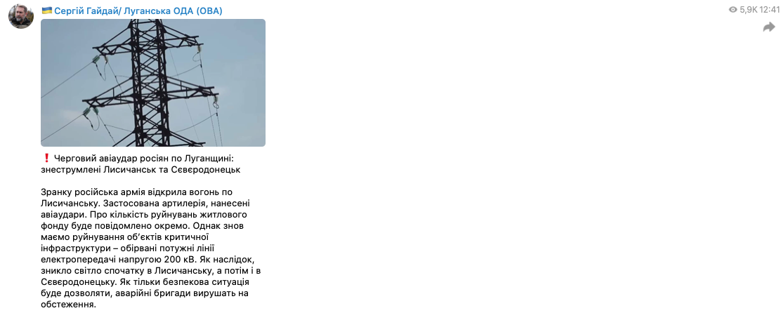 Лисичанск и Северодонецк в Луганской области остались полностью без электричества. В результате обстрела повреждены ЛЭП.