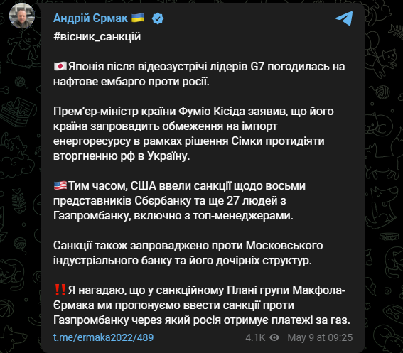 "Премьер-министр страны Фумио Кисида заявил, что его страна введет ограничения на импорт энергоресурса в рамках решения "Семерки" противодействовать вторжению России в Украину", - написал Ермак.