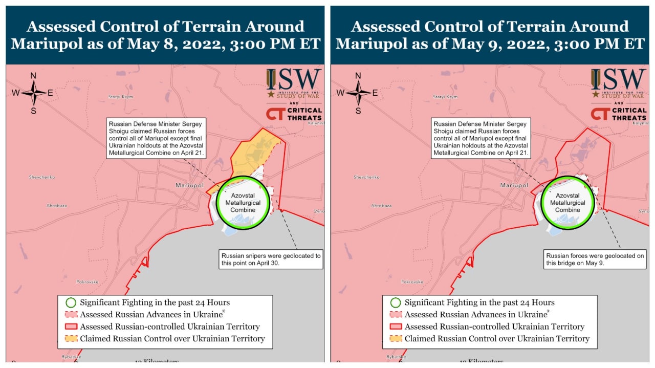08:13 Сравнение военных карт за 8 и 9 мая по данным Института изучения войны (США).