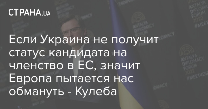 Министр иностранных дел Дмитрий Кулеба считает, если Украина не получит статус кандидата на членство в ЕС, это означает, что Европа пытается нас обмануть.