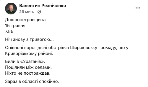 В Днепропетровской области, по словам председателя местной ОВА Валентина Резниченко, россияне в полночь дважды обстреляли Широковскую общину в Криворожском районе из реактивных систем залпового огня "Ураган".
