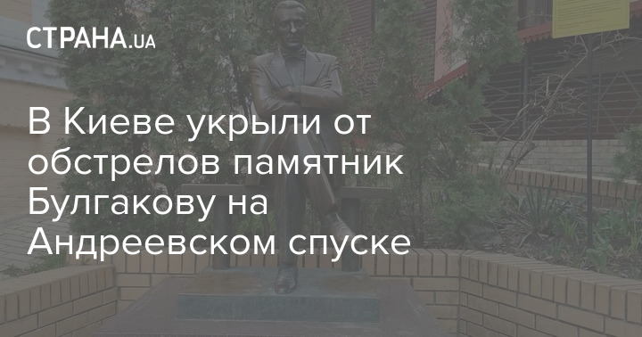 Памятник писателю-киевлянину Михаилу Булгакову, который установлен у его дома-музея на Андреевском спуске, сейчас укрыли, чтобы он не был поврежден во время обстрелов.