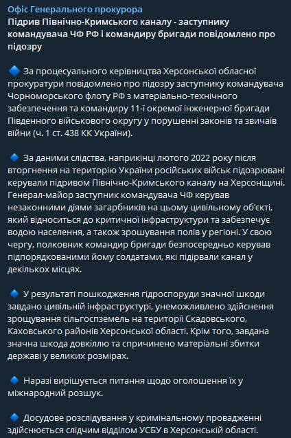 "Заместитель командующего ЧФ руководил незаконными действиями захватчиков на этом гражданском объекте, который относится к критической инфраструктуре и снабжает водой население, а также орошение полей в регионе. В свою очередь, полковник командир бригады непосредственно руководил подчиненными ему солдатами, взорвавшими канал в нескольких местах", - говорится в сообщении.