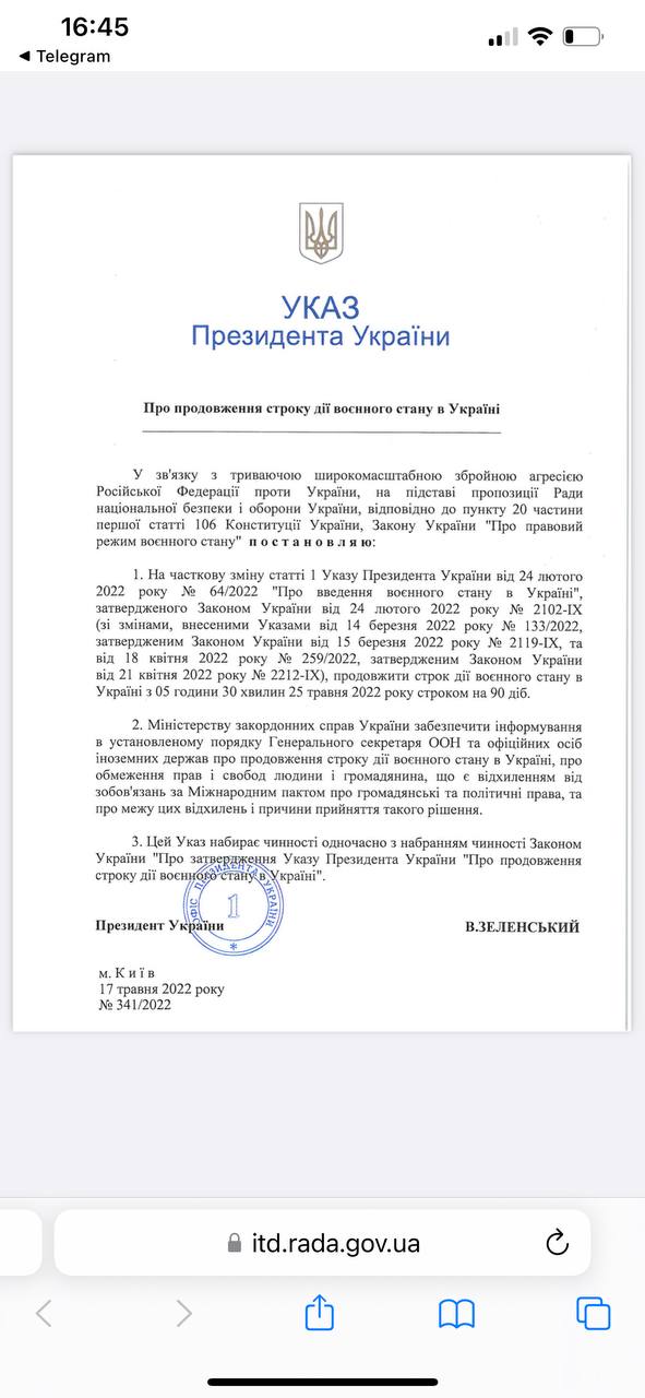 Всеобщую мобилизацию в Украине также продлили на 90 дней.