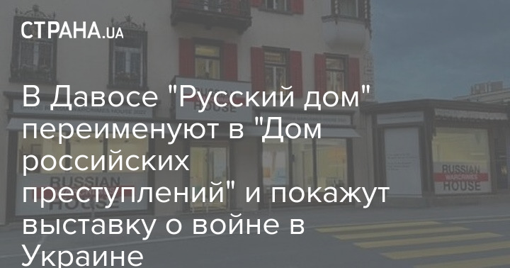 Площадку "Русский дом" (Russian house) в швейцарском Давосе переименуют в "дом российских преступлений" (Russian war crimes house) и там же организуют выставку о войне в Украине. Об этом сообщает "Фонд Виктора Пинчука", который выступил организатором выставки ежегодной встречи Всемирного экономического форума в Давосе наравне с PinchukArtCentre в партнерстве с Офисом президента Украины, Министерством иностранных дел Украины, интернет-изданием Украинская правда и Украинской ассоциацией профессиональных фотографов.