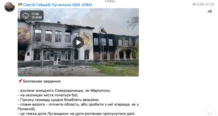 "Сейчас бои идут на околицах Северодонецка. Всего на фронте отбиты одиннадцать атак врага, уничтожены восемь танков, три артиллерийские системы, десять единиц боевой бронированной техники, три специальных бронированных автомобиля и шесть единиц автомобильной техники противника.