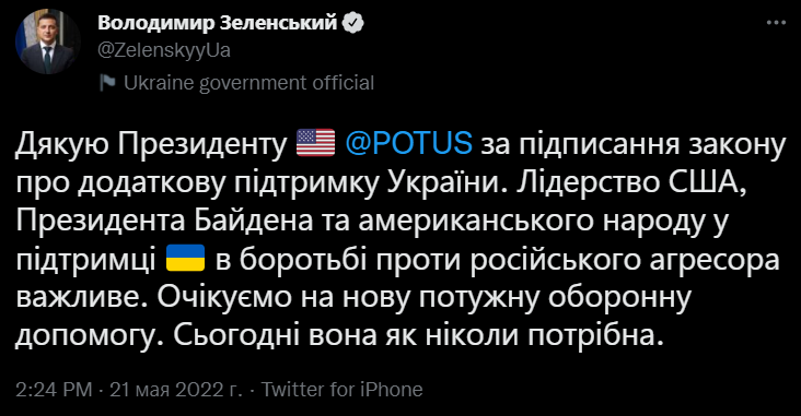 "Спасибо Президенту США за подписание закона о дополнительной поддержке Украины. Лидерство США, президента Байдена и американского народа в поддержке Украины в борьбе против российского агрессора важно. Ожидаем новой мощной оборонительной помощи. Сегодня она как никогда нужна", - сообщил президент Украины.