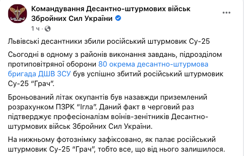 Командование Десантно-штурмовых войск ВСУ сообщает о том, что львовские десантники сбили российский штурмовик Су-25.