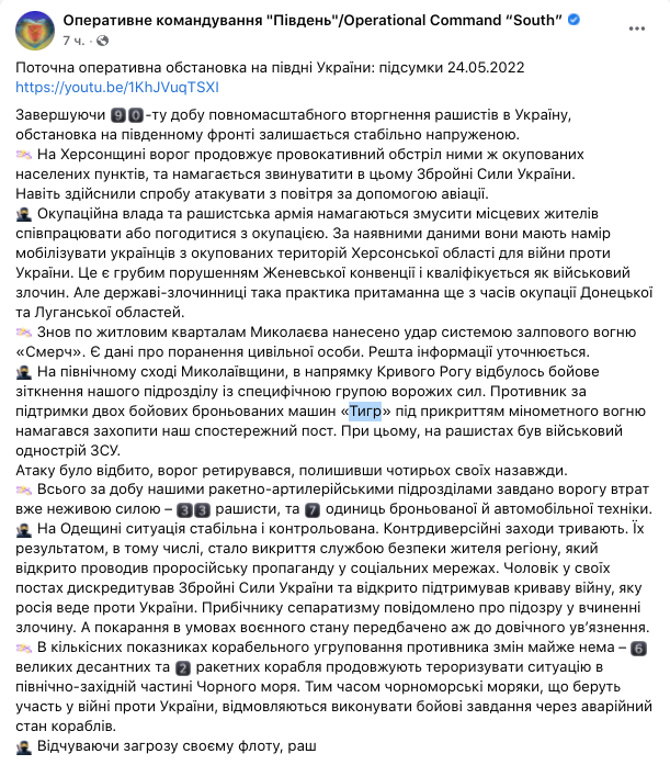 На северо-востоке Николаевской области в направлении Кривого Рога военные РФ пытались захватить украинский наблюдательный пост, переодевшись в форму ВСУ.