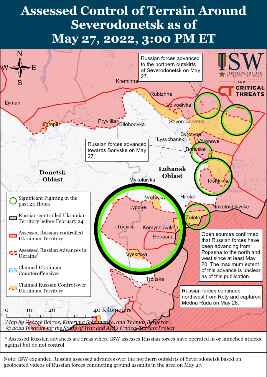 Также, по их мнению, российские войска в Попасной стремятся продвигаться на север, чтобы поддержать окружение Северодонецка, а не на запад, в сторону Бахмута.