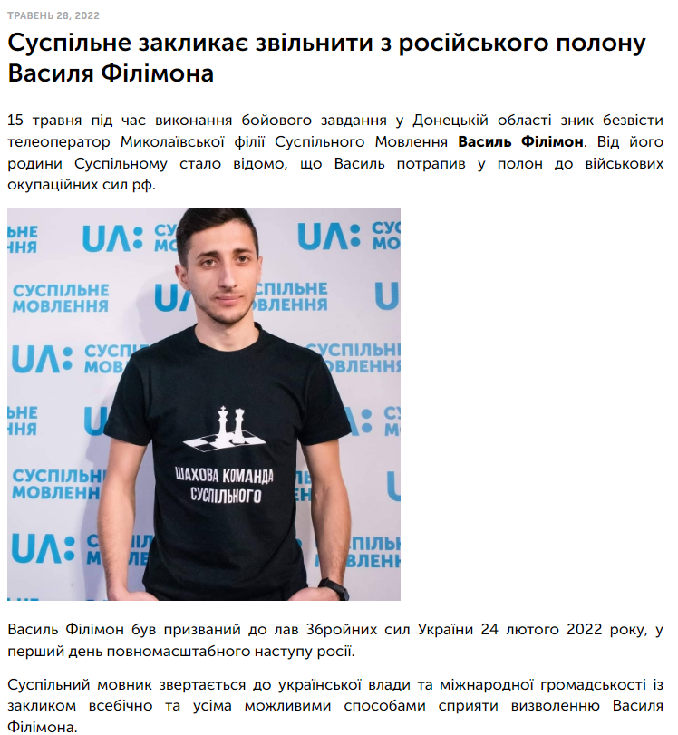 Позже стало известно, что он попал в плен к русским оккупантам. "Суспільне" обратилось к украинским властям и мировому сообществу с призывом максимально способствовать освобождению Василия Филимона.