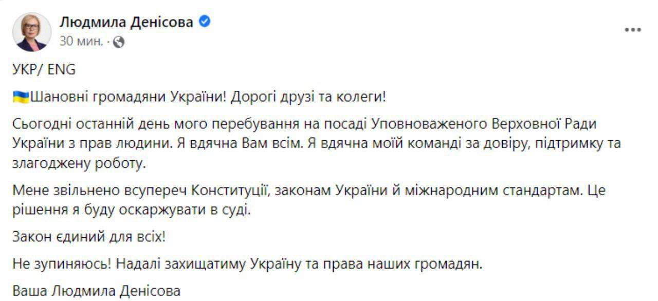 Сегодня последний день моего пребывания в должности Уполномоченного Верховной Рады Украины по правам человека. Я благодарна Вам всем. Я благодарна моей команде за доверие, поддержку и слаженную работу.