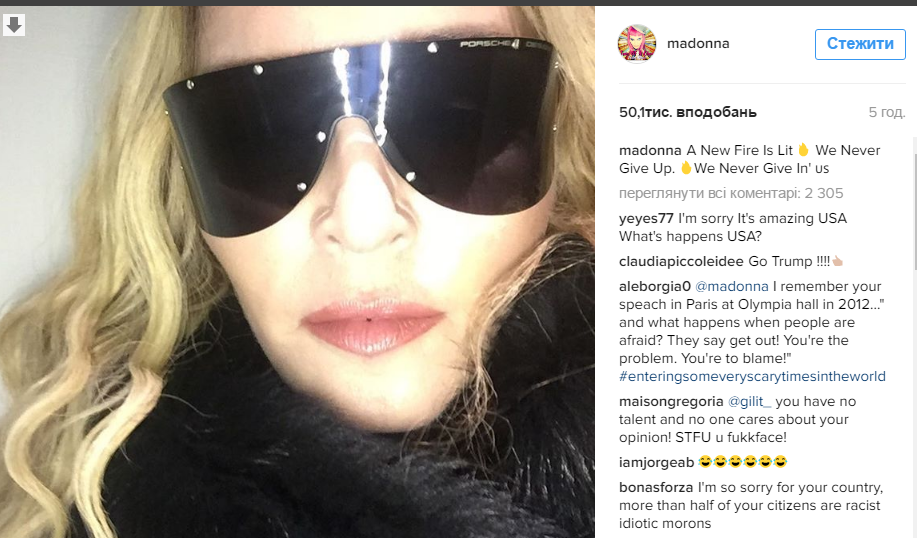 В своем Instagram певица Мадонна написала, что "зажжен новый огонь, мы никогда не отступаемся и никогда не сдаемся".