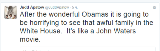 Режиссер, продюссер и сценарист фильмов "Кабельщик", "Аферисты Дик и Джейн" Джадд Апатоу посетовал, что в Белом доме после чудесных супругов Обама будет ужасно видеть "ту ужасную семью". Он сравнил происходящее с плохим кино.