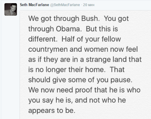 Звезда "Гриффинов" Сет МакФарлейн отметил: "Некоторым не нравился Буш. Некоторым не нравился Обама. Но это другое. Забудьте о неприязни. Сейчас многие испытывают неподдельный страх. Это новое".