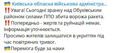 08:35 ПВО сегодня утром сбила ракету над Обуховским районом Киевской области.