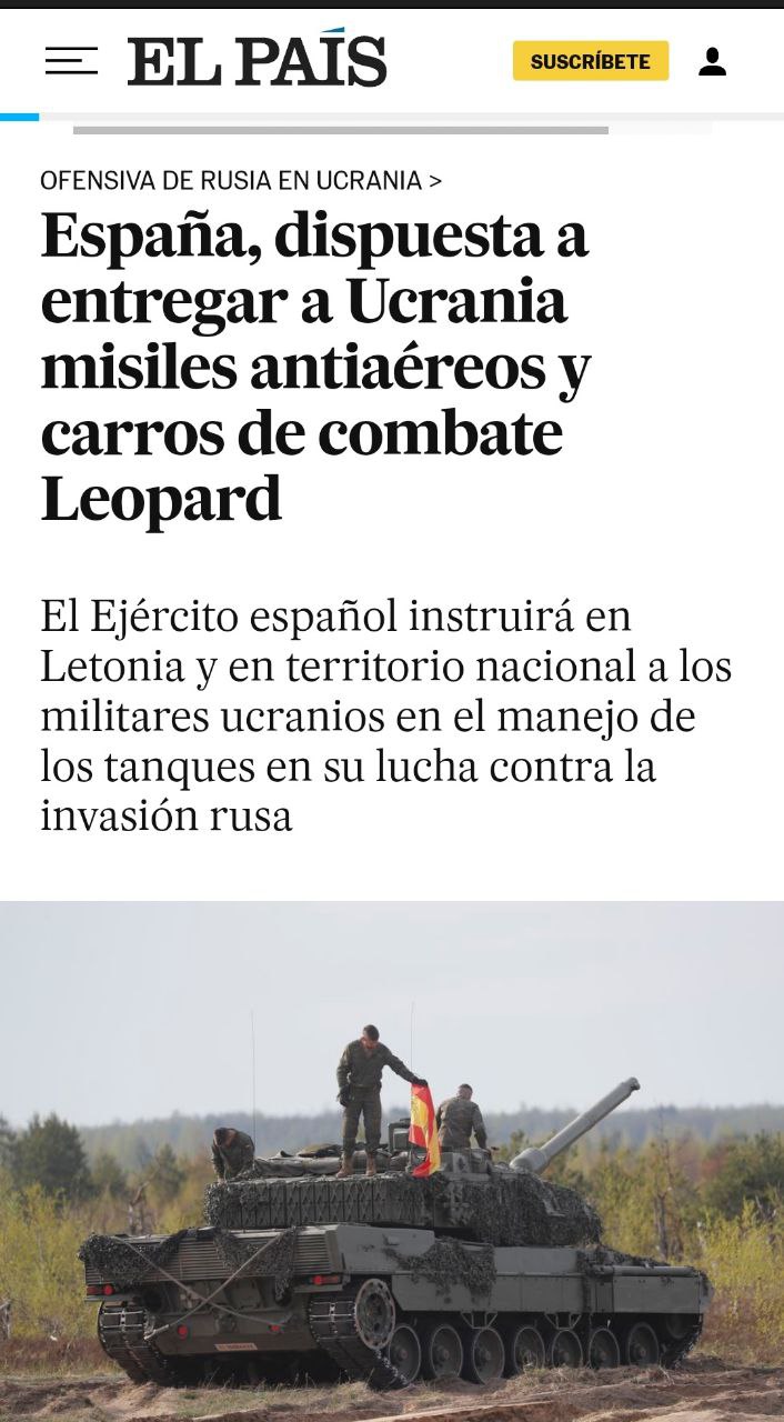 09:30 Испания готова поставить Украине зенитно-ракетные комплексы и боевые танки "Леопард", сообщает издание El Pais со ссылкой на свои источники.